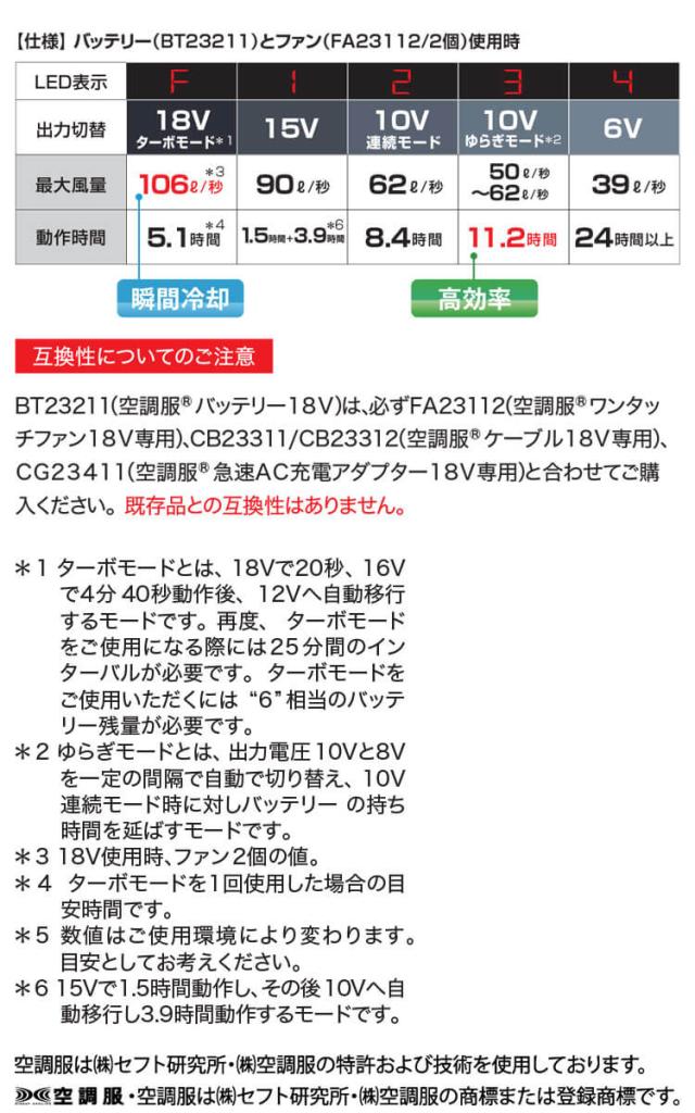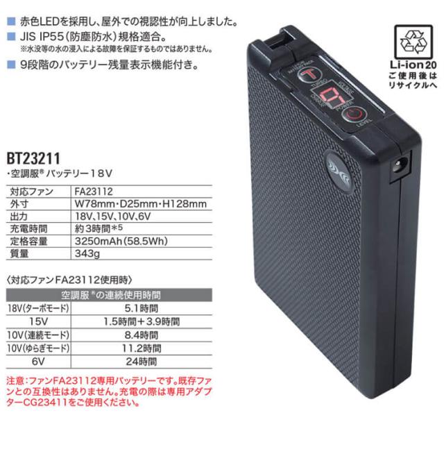 注意:ファンFA23112専用バッテリーです。既存ファンとの互換性はありません。充電の際は専用アダプターCG23411をご使用ください。