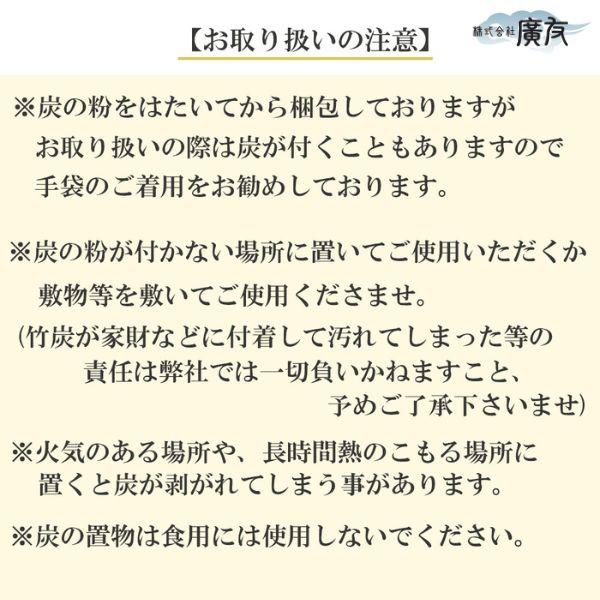 ※炭の粉が付かない場所に置いてご使用いただくか、敷物などを敷いてご使用くださいませ。