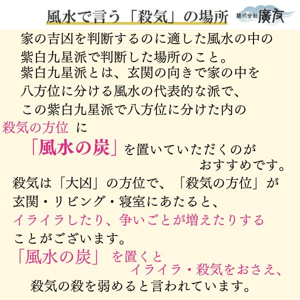 「風水の炭」を置くとイライラ・殺気を押さえ、殺気の殺を弱めるといわれています。