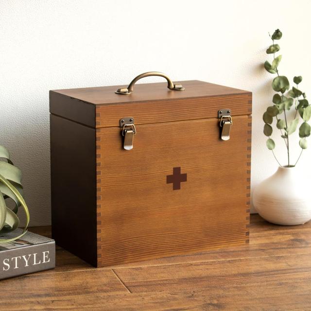 救急箱 木製 日本製 大容量 薬箱 薬 収納 ( 薬ケース 救急ボックス 薬入れ 医療ボックス 天然木 トレイ付き 収納ケース 医薬品 くすり 救急 衛生用品 応急手当 おしゃれ 持ち手付き ロック付き 組木 )