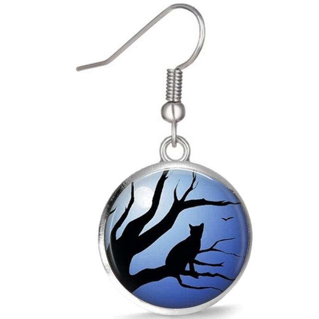 銀色シルバーの丸型のカボション用の台座に月夜に樹木にのるネコをデザインしたオシャレなステンレスピアス。