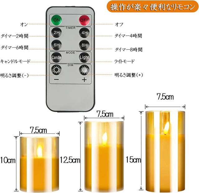 サイズ:L(直径7.5cm×高さ15cm)、M (直径7.5cm×高さ12.5cm)、S(直径7.5cm×高さ10cm)、点灯モード:揺らぎ・一定 キャンドル本体の電池:単4電池(各3本・別売り) リモコン用電池:ボタン電池1個(付属)。省電力のLEDライトは電池が長持ちするため、ゆっくりと光を楽しむことが可能です。