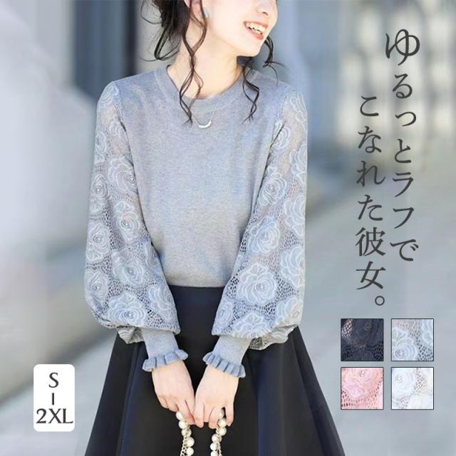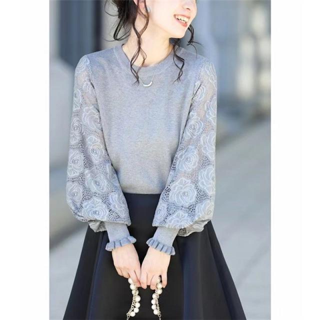 カットソー レディース ニット トップス Tシャツ レース 韓国 クルーネック 春服 ショット丈 長袖 tシャツ シン