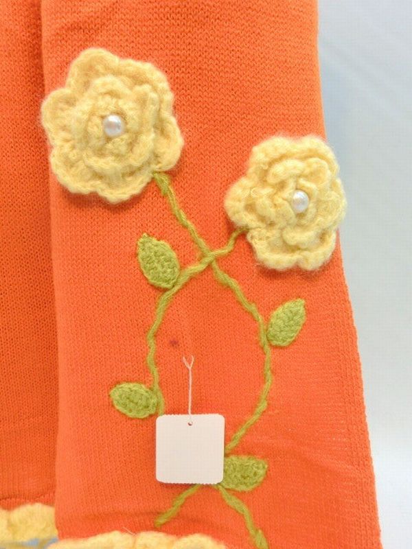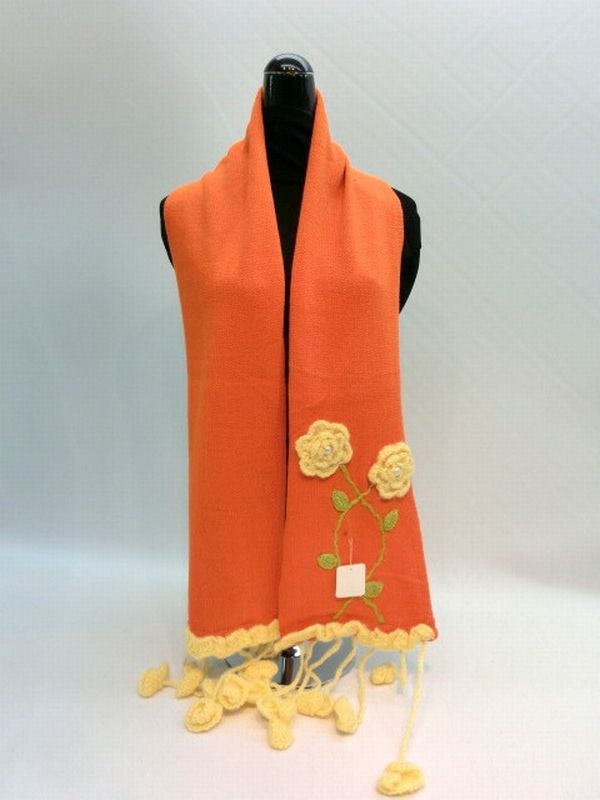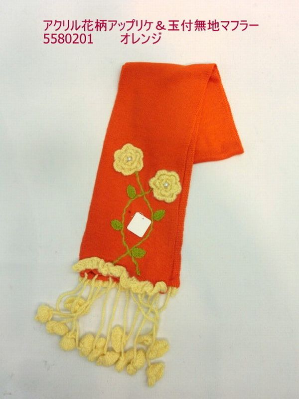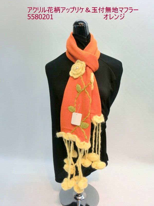 | アクリル無地マフラーに可愛いい花柄のアップリケを付けました。裾には豪華な玉をあしらいました。 秋冬のオシャレにぴったりの商品です。 |