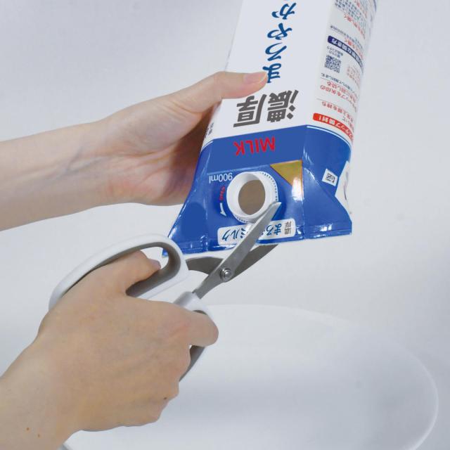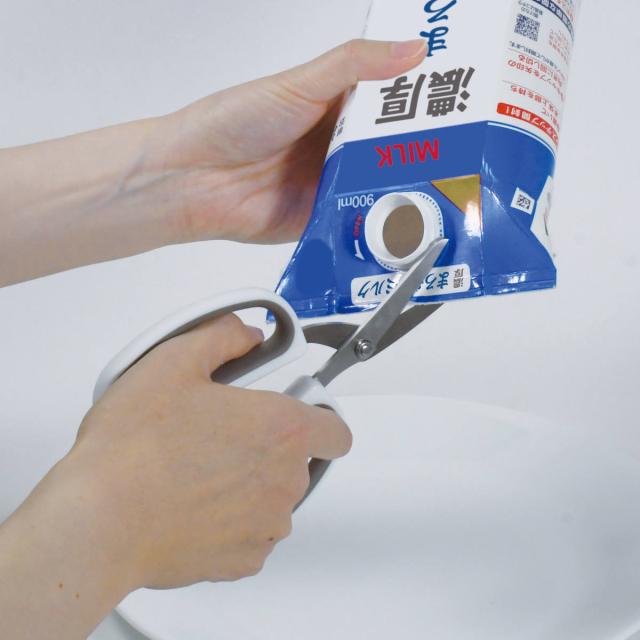 紙パックの解体に便利な分別はさみです。手が痛くなりにくく、しっかり握れるハンドルにL字形状が、スムーズに刃が進むポイントです。