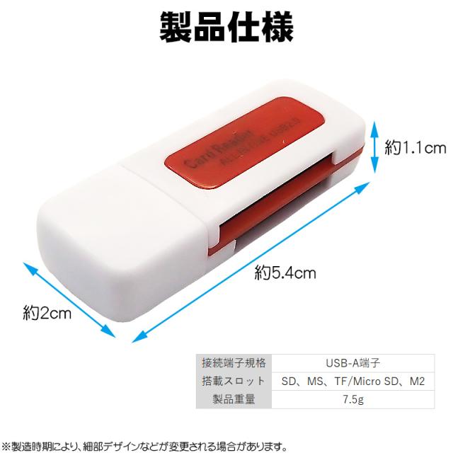 | ・対応OS:Windows MacOS ・サイズ:約L54×W20×D11(mm) ・重さ:約7.5(g) ・接続端子規格:USB-A端子 ・搭載スロット:SD MS TF/MicroSD M2 |