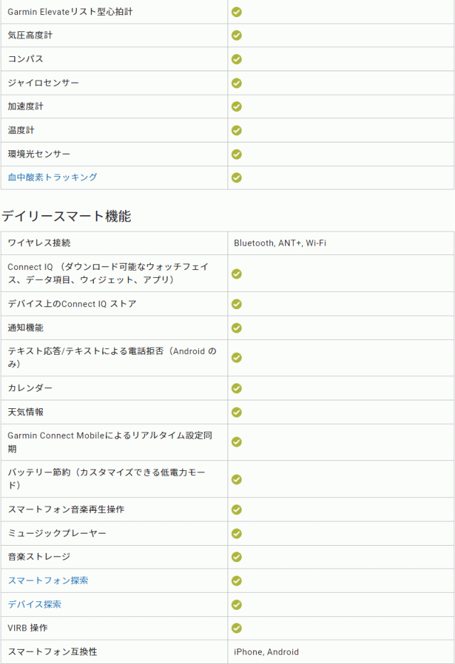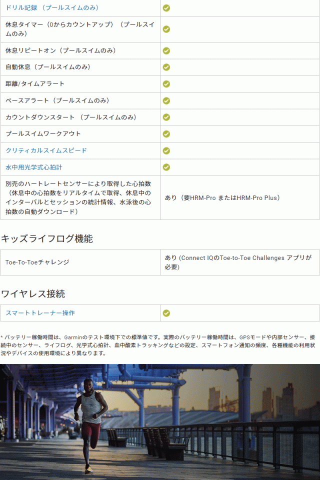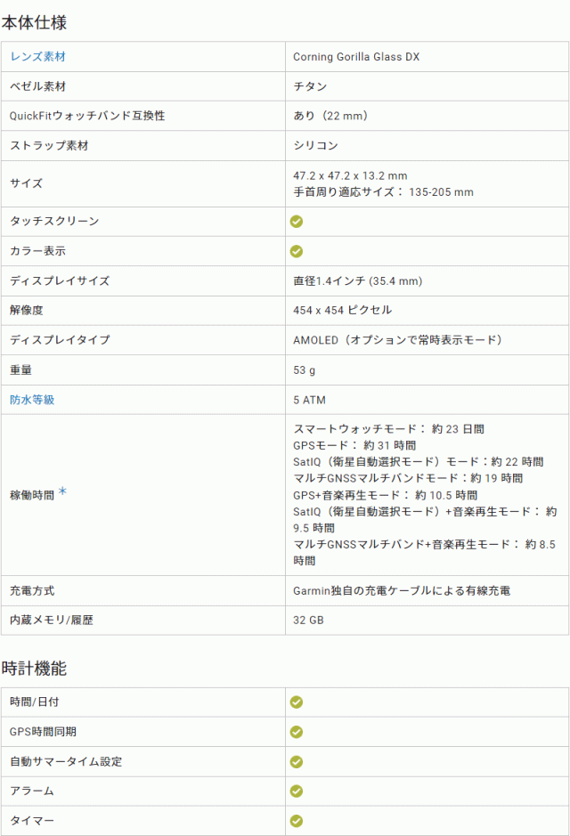 ■稼働時間:スマートウォッチモード約23日間、GPSモード約31時間、SatIQ(衛星自動選択モード)モード約22時間、マルチGNSSマルチバンドモード約19時間、GPS+音楽再生モード約10.5時間、SatIQ(衛星自動選択モード)+音楽再生モード約9.5時間、マルチGNSSマルチバンド+音楽再生モード約8.5時間