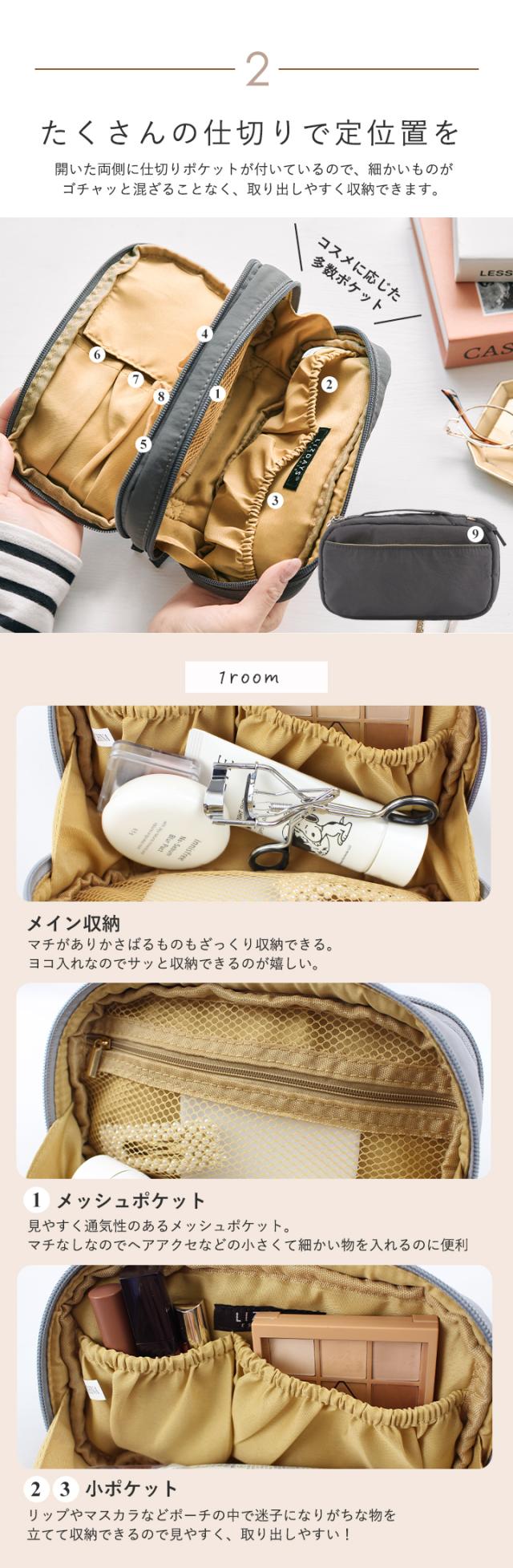 かさばりがちなメイク道具を仕切りポケットで、見やすく収納!