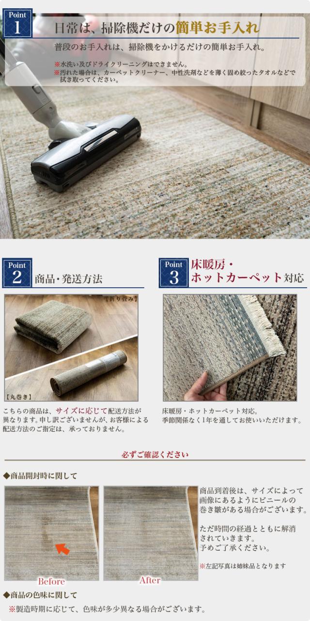 | 【こちらの商品の梱包方法】 ・サイズに応じ「折り畳み」「丸巻き」のどちらかで配送いたします。(お客様によるご指定はいただけません) ※商品は開梱時、ラグマット、カーペットの毛並みにムラなどがございますが、使用するにつれ、なくなります。 ※商品によりサイズに多少の誤差があります。 ※カラーはディスプレイ上、実際の色と多少異なる場合がございます。 ※ウィルトン織りの製法により、使用され、裏面に塗られる仕上げの接着塗料は、ご使用当初、常温のもとで気化( 蒸発 )する、揮発性の匂いがございます。 ※開梱当初は、遊び毛が出ますが、ご使用につれ少なくなっていきます。 ※滑りやすい場所でのご使用は市販のカーペット用の滑り止めネットのご使用をお勧めします。 ※汚れた場合は、カーペットクリーナー、中性洗剤などを薄め固く絞ったタオルなどで拭き取ってください。 | |