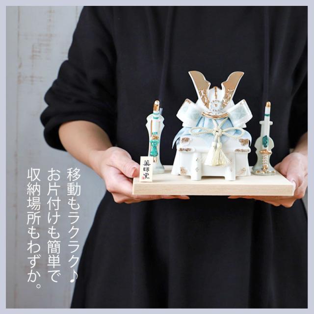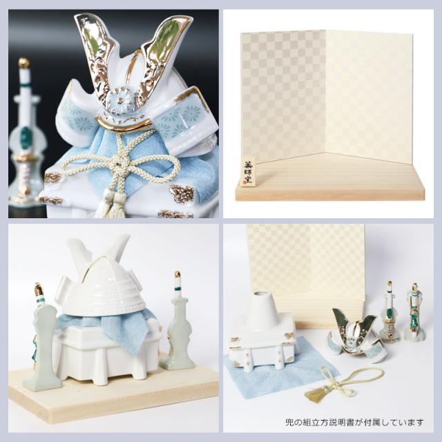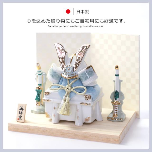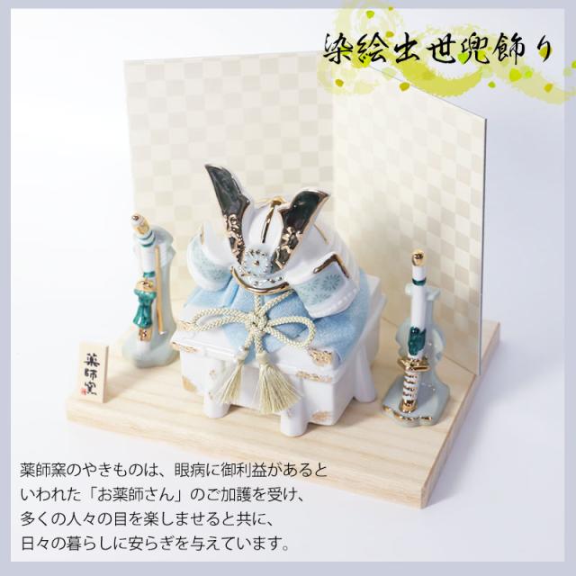 五月人形 染絵出世兜飾り 白藍 薬師窯 コンパクト おしゃれ 兜飾り かっこいい 端午の節句 平飾り こどもの日 子供の日 陶器 弓矢 刀 初節句 節句飾り 省スペース マンション アパート インテリア 人形 和雑貨 海外土産