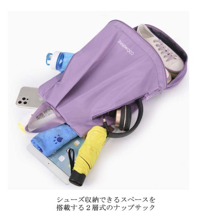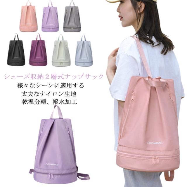 | 【シューズ収納2層式ナップサック】 【乾湿分離、撥水加工】 【丈夫なナイロン生地】 【様々なシーンに適用する】 シューズ収納できるスペースを搭載する2層式のナップサック 撥水加工のナイロン生地を採用し、 バックには乾湿分離のポケットを配置して、 汚して濡れた衣類やタオルを清潔な衣類と分けて収納できる 水泳、サッカー、ジム、キャンプ、ショッピング、学校、登山、旅行など様々な場面で活躍 | |