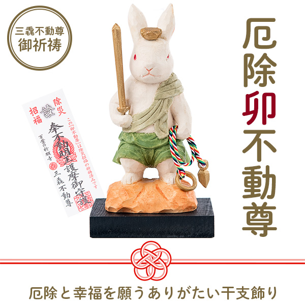 愛らしい幸福の象徴を、厄除けに絶大な功徳を持つ不動明王の姿で表したものが「厄除 卯不動尊」です。