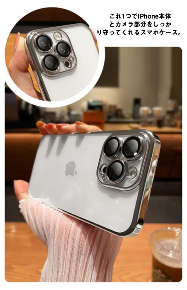 | レンズフィルム一体型設計!ケース1つで全面保護! これ1つでiPhone本体とカメラ部分をしっかり守ってくれるスマホケース。 上品で飽きのこないシンプルなデザイン、メッキ加工とクリアバックで、iphone本来の美しさをより一層演出し、「大人かっこいい」を実現。 装着感ゼロの薄さ、本体にぴったりフィットし、スリムで握りやすい。 カメラレンズまでフルカバー、カメラレンズを傷からしっかりと全面保護。 前面フレーム部分は画面よりもやや高め設計され画面を下にして置いてもスクリーンが擦れず安心。 背面は高透過率、黄変しにくいPC素材で、いつまでもキレイなまま、アイフォンのアイコンを魅せ、よりスタイリッシュに本体のデザインを活かせるケースです。 四つの角にはエアクッション内蔵されており、落下の衝撃を吸収し、本体へのダメージを最小限に。 表面はコーティングが施されているので、手触りがよく、擦り傷・汚れ・油に強く、指紋の付着を防止します。 スピーカー部分は防塵ネット設計され、ほこりの侵入を防ぎながら、音声への影響がありません。 | |