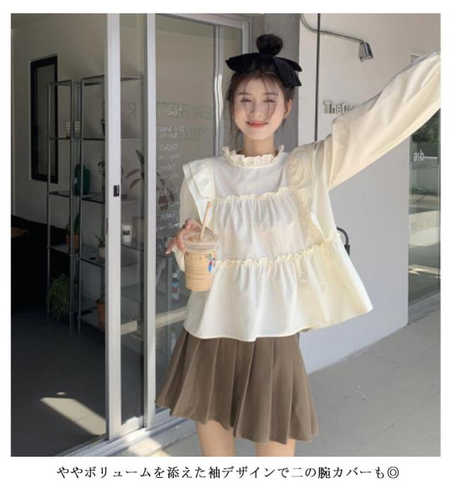 フリル ブラウス レディース トップス きれいめ 長袖 ハイネック 立ち襟 フリル ギャザー ぽわん袖 無地 送料無料 ティアード ブラウス レディース トップス 可愛い カジュアル シンプル