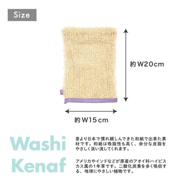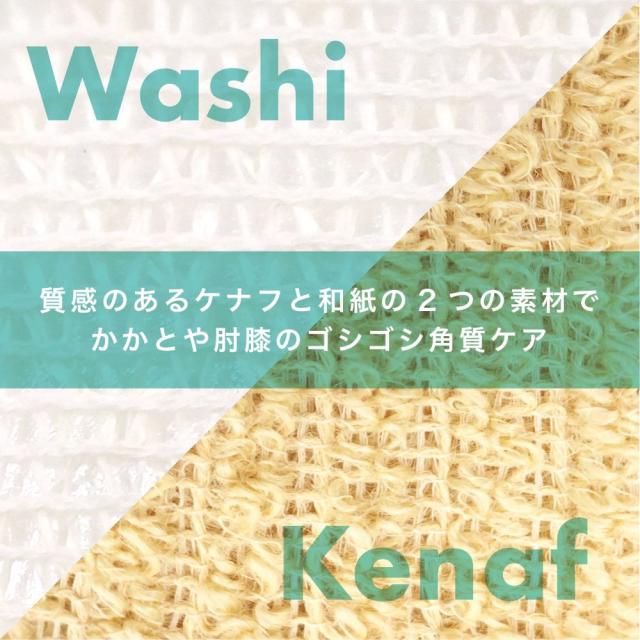 ●やさしい毛質のケナフで体全体を洗い、反対側の和紙で肘・膝・かかとの角質ケアをオススメしております。