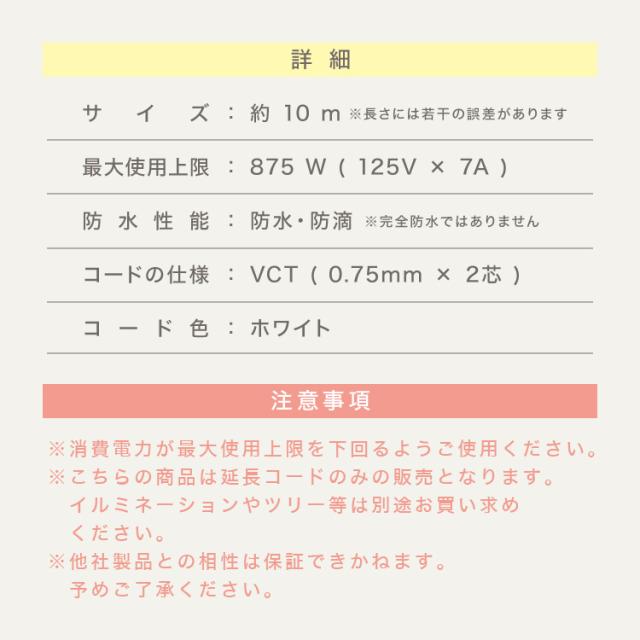 | 注意事項 | ・消費電力が最大使用上限を下回るようご使用ください。 ・こちらの商品は延長コードのみの販売となります。 ・他社製品との相性は保証できかねます。予めご了承ください。 ・商品は、モニターによって色合いが異なって見える場合があります。 ・仕様・デザインは改良のため予告なく変更することがあります。 |