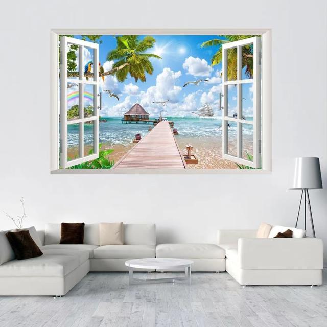 ウォールステッカー AFC008 3D窓 海 砂浜 ヤシ 癒す DIY 壁紙 インテリアシート 剥がせるシール 送料無料