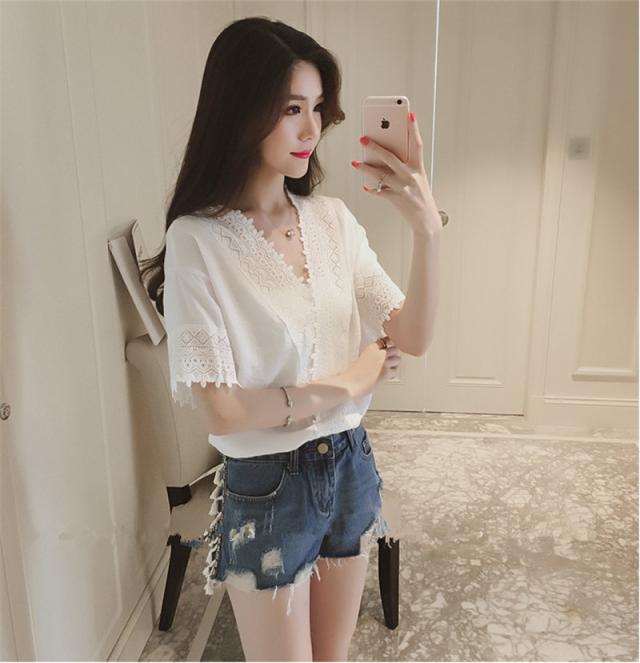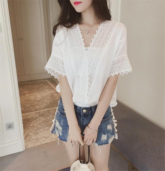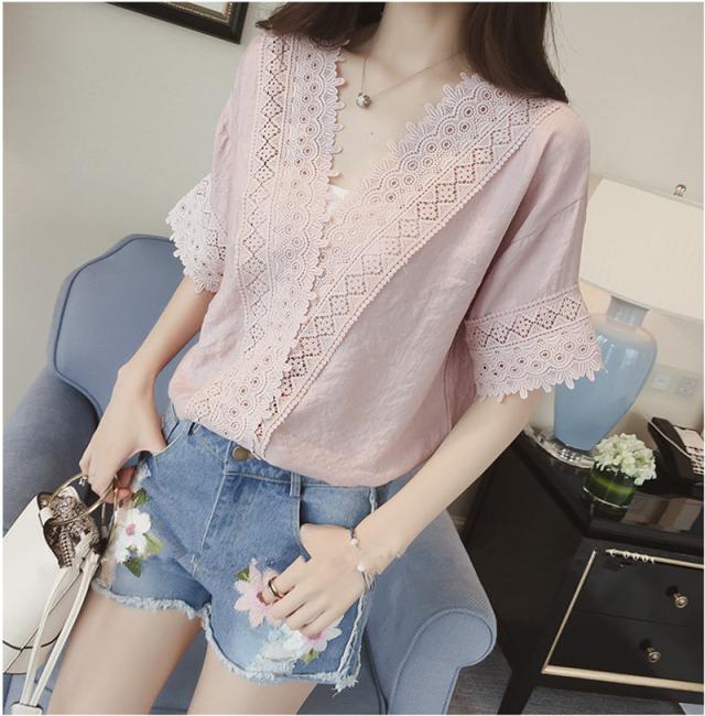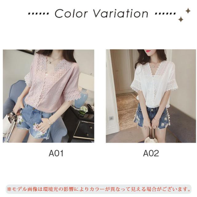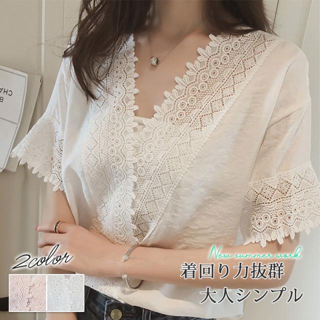 ブラウス シャツ 夏 半袖 レディース カジュアル 体型カバー 春夏 Vネック レース 通気性 シンプル おしゃれ 通勤 トップス