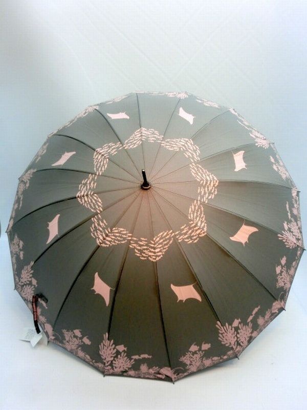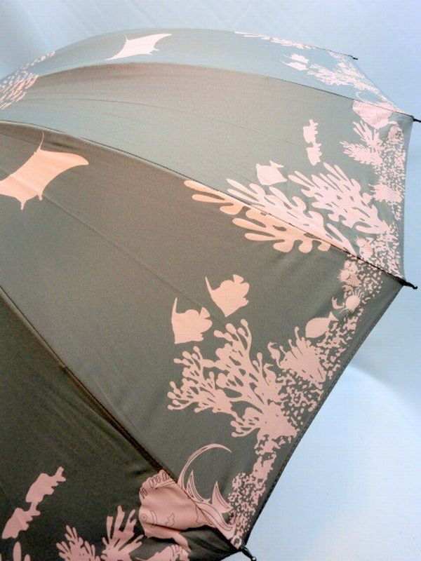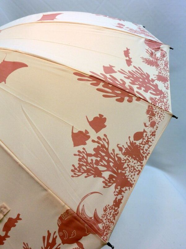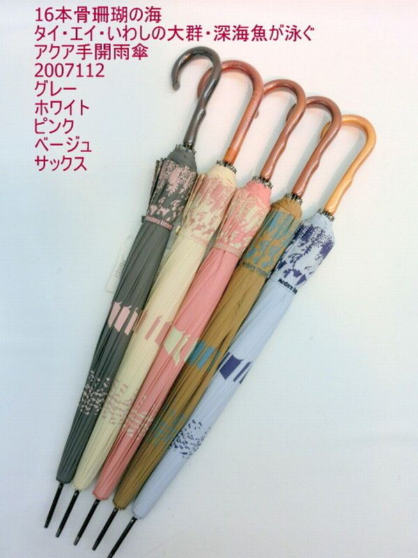 | 和風16本骨アクア柄手開き雨傘。キレイな珊瑚の海にタイ、エイ、カニ・深海魚、いわしの大群が泳いでいる楽しい柄。柄がつながる駒取り手法の売れ筋雨傘です。 雨の日が楽しみになるオシャレな雨傘です。 |