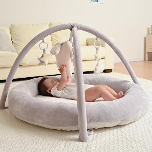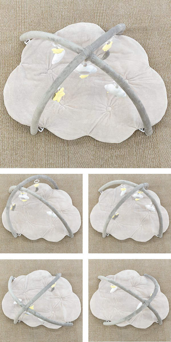 ふわふわな柔らかい雲をモチーフにしたプレイジムマットです。トイバーはママのおなかの中を連想させる丸みのあるアーチ型で、どこか安心感があり、お子さまが心地良く遊べる空間になります。流行に左右されずどんなシーンにも溶け込んでくれるペールトーンのカラーが、優しくお部屋を彩ります。出産祝いのプレゼントにも最適です。