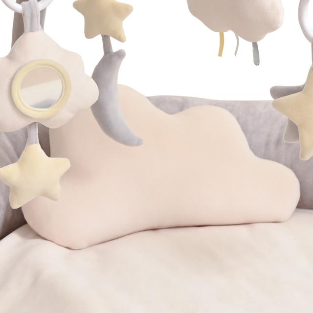 雲の形のクッションが付属しています。腹ばい期のおなか周りをやさしくサポートします。このクッションとマットは洗濯可能なので、お手入れもラクラクです。