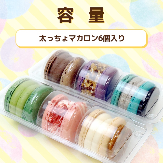 商品名 太っちょマカロン 人気6個セット 容量 太っちょマカロン6個入り 原材料名 〈クッキー&クリーム〉ビスケット(国内製造)、発酵バター、プロセスチーズ、アングレーズソース(牛乳、砂糖、卵黄)、粉糖(砂糖、コーンスターチ)、アーモンドパウダー、砂糖、卵白、小麦粉/乳化剤、香料、膨張剤、糊料(加工澱粉)、着色料(青1)、pH調整剤、酵素、(一部に小麦・卵・乳成分・アーモンド・大豆を含む)