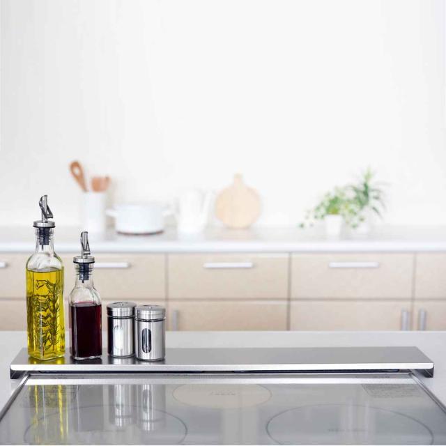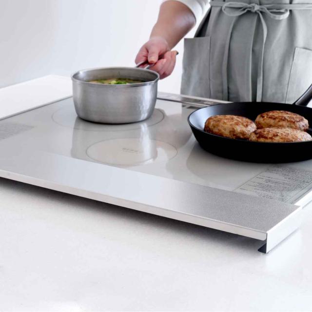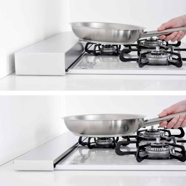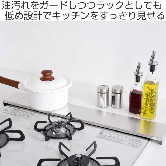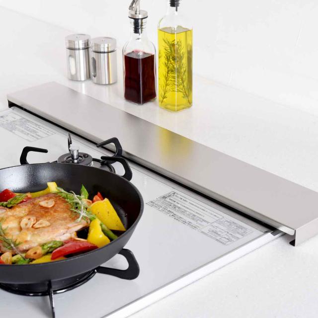 炒め物や揚げ物をする時に気になる油などの汚れから排気口をガードする、コンロ奥カバー&ラックです。掃除しにくい排気口の汚れを防ぎつつ、ラックとして調味料やお鍋を置くことができます。ロータイプのシンプルなデザインは圧迫感がなく、キッチンをすっきりスマートな空間に見せます。