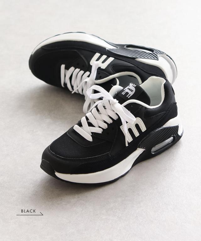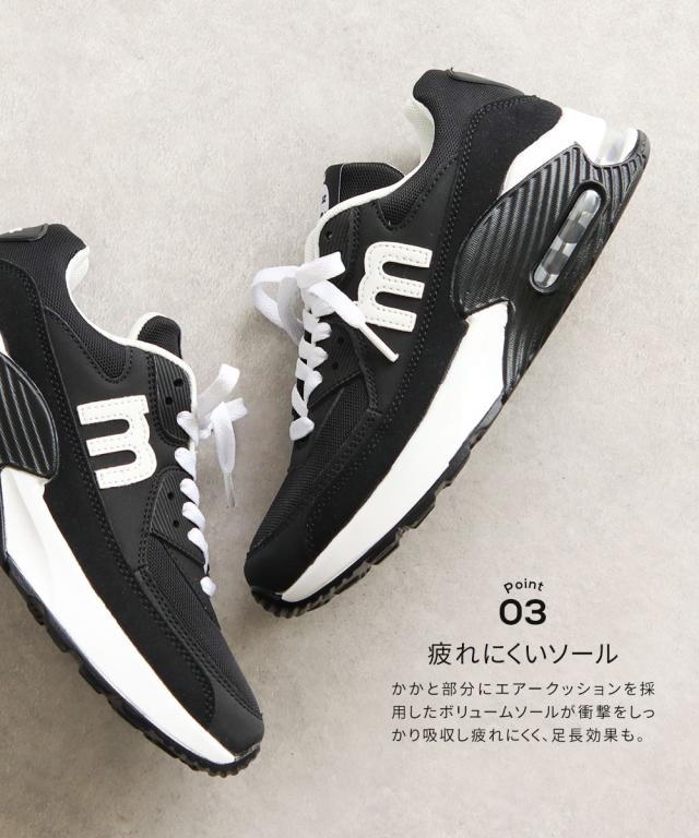 かかと部分にエアークッションを採用したボリュームソールが衝撃をしっかり吸収し疲れにくく、足長効果も。