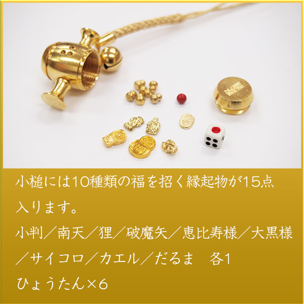 ・セット内容:小槌 大入袋入り (桐箱ではございません)、鈴と紐(ひも)、小槌の中身:小判、南天、狸、破魔矢、恵比寿様、大黒様、サイコロ、カエル、だるま 各1、ひょうたん×6