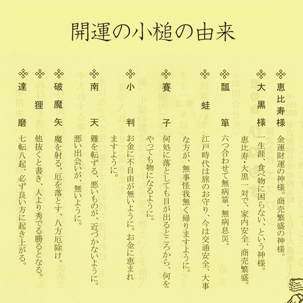 ・10種類の縁起物が詰まった、振れば中から大判小判がザックザクといわれる打出の小槌の中に福をたっぷり詰め込んだ江戸時代から続く縁起物。