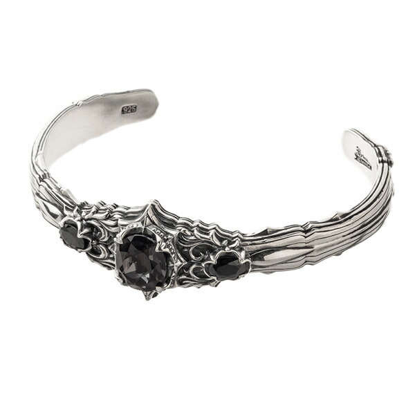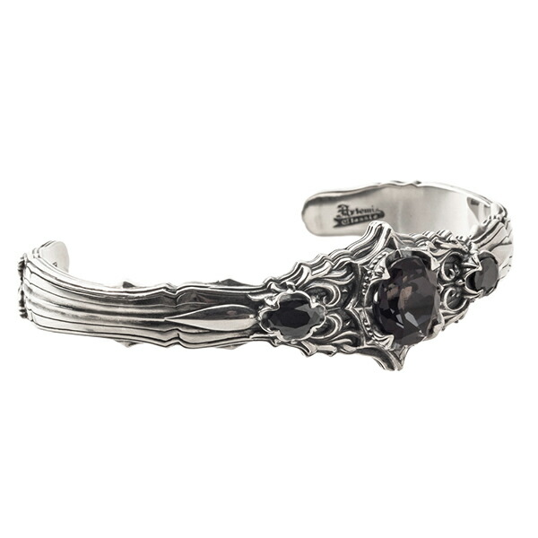 採光が綺麗な大粒ブラックミスティッククォーツをセンターに、両脇をブラックCZで固めたバングル。透明なブラックミスティッククォーツは採光が綺麗。8つの光状にデザインされたアウトラインやトレサリー型にくり抜かれた石枠もアルテミスならでは。幾重にも重なるレーヤードと繊細な唐草デザイン。裏は透かしで教会柄があしらわれ、石の採光の役割をしております。裏にはブランドと925、Black Knight刻印。他のブラックナイトシリーズと合わせてのコーディネートもおススメ。