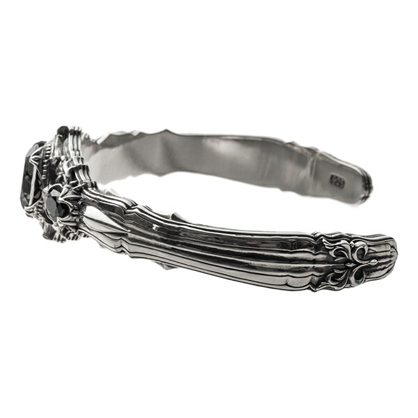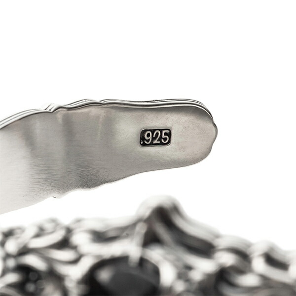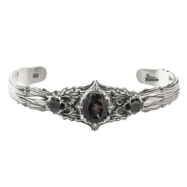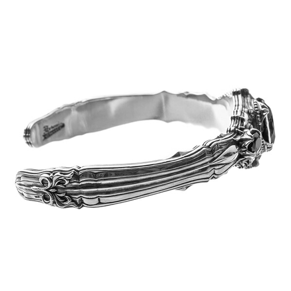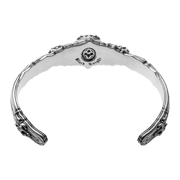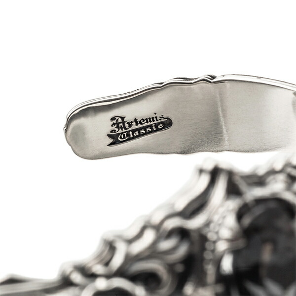 | 仕様 | 採光が綺麗な大粒ブラックミスティッククォーツをセンターに、両脇をブラックCZで固めたバングル。透明なブラックミスティッククォーツは採光が綺麗。8つの光状にデザインされたアウトラインやトレサリー型にくり抜かれた石枠もアルテミスならでは。幾重にも重なるレーヤードと繊細な唐草デザイン。裏は透かしで教会柄があしらわれ、石の採光の役割をしております。裏にはブランドと925、Black Knight刻印。他のブラックナイトシリーズと合わせてのコーディネートもおススメ。 |
