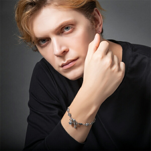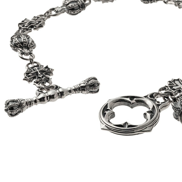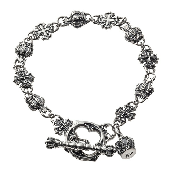 | 仕様 | トレサリーデザインのリングにTバーで留める形式の925シルバー製ブレスレット。チェーンは王冠とアイアンクロスのパーツを交互に配したデザイン。服装にも合わせやすい細めのブレスレット。アルテミスキングスらしく随所にデザインされた王冠が繊細。ぶら下がった王冠チャームにAKと925の品質刻印。 |