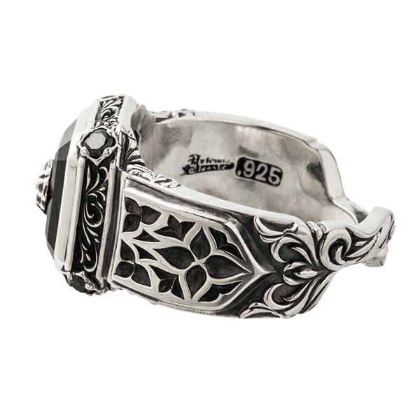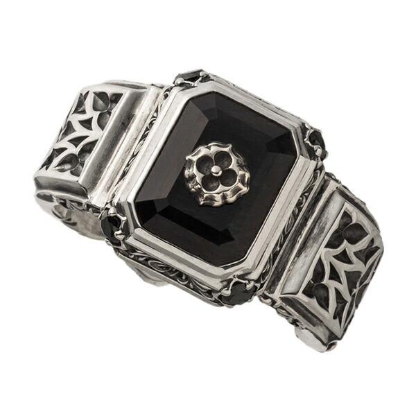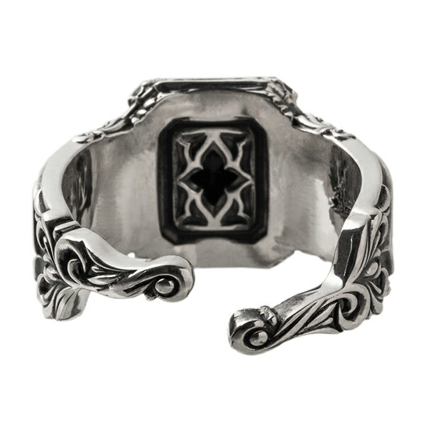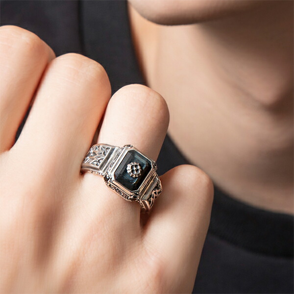 唐草とトレサリー柄が施された銀とスクエアのブルータイガーアイが絶妙に調和したデザイン。銀と石の美しさをバランス良く融合させたリング。黒に近い濃紺石に銀の配色は色々な服装にも合わせ易い。裏と石センターには教会柄の銀細工が施されます。タイガーアイは虎の目のような模様が特徴の天然石。金運・仕事運を高めるパワーストーンとしても有名。猫の目のように光り輝くキャッツアイ効果も美しい石。同デザインのペンダントを合わせてコーディネートもおススメ。