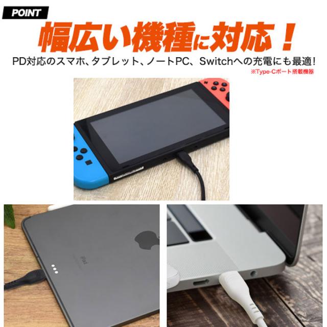 USB PD対応のスマホ、タブレット、ノートPC(Type-Cポート搭載)への、最大40W超急速充電を可能にします。
