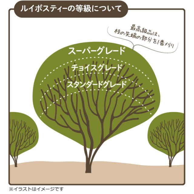 ルイボスティーには、スーパーグレード・チョイスグレード・スタンダードグレードの等級があります。枝の先端の部分を1番刈りした”スーパーグレード”は、希少価値が高く、値段も高めですが、風味が豊潤でまろやかなうえ、“ポリフェノール”も豊富に含まれています。