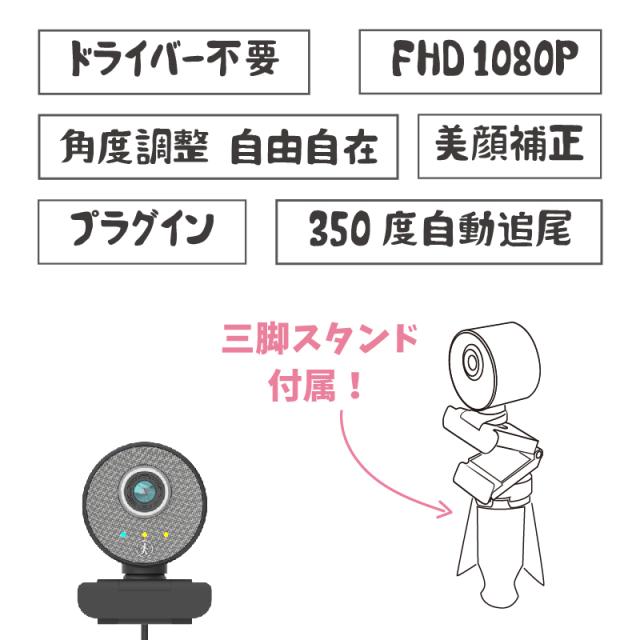 SaiEL 美顔補正&自動回転機能付きフルハイビジョン WEBカメラ【2色】黒/白 高画質 1080P 三脚スタンド付き ドライバー不要 プラグイン 自動追尾 美顔補正 きれいに撮影 角度調整 テレワーク