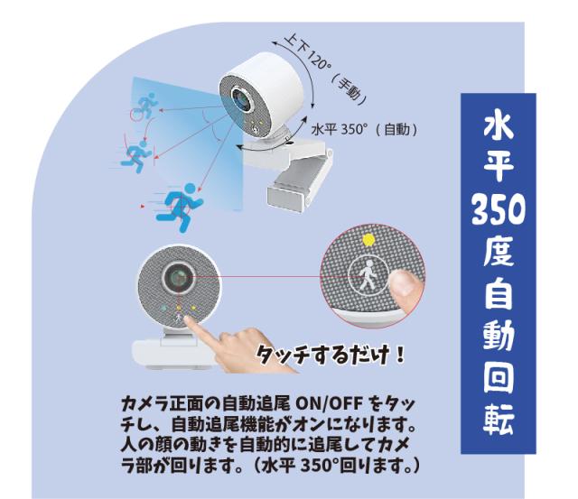 ★水平350度自動回転。人の顔の動きを自動的に追尾してカメラ部が回ります。