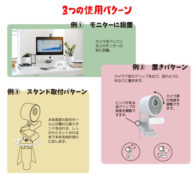 ★3つの使用パターン。モニターに設置する・机に置く・付属の三脚スタンドに取り付け。