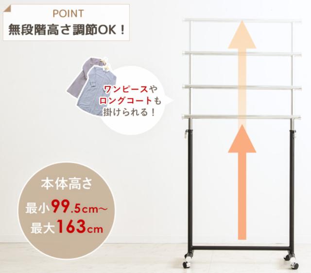 本体の高さは無段階で99.5〜163cmまで自由に調節できます。丈の長いワンピースやロングコートなどの収納もしやすくなっています。