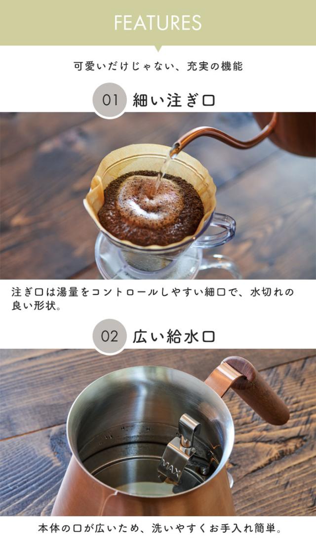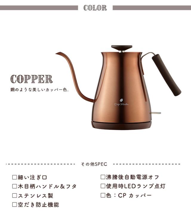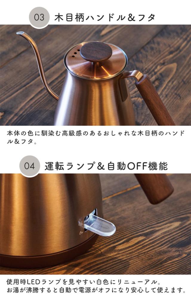 | ◇細い注ぎ口 ◇木目柄ハンドル&フタ ◇ステンレス製 ◇空だき防止機能 ◇沸騰後自動電源オフ ◇使用時LEDランプ点灯 ◇色:CP カッパー |