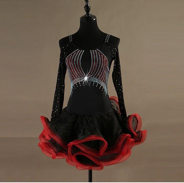 【レビュー投稿で+5%還元】社交ダンス ラテンドレス 競技用ドレス 長袖 キャミソール ワンピース ステージ衣装 ラテン専用ドレス レッスン着 ラテンドレス スパンコール 発表会用 社交ダンス演出服 ルンバ サンバ ワルツ フリル裾 ブラック レッド S M L XL 2XLas002s1