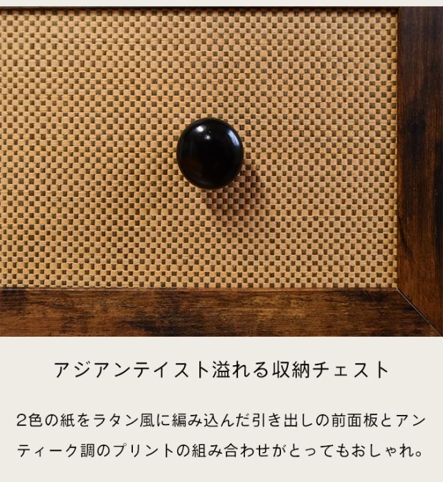 | アジアンテイスト溢れる収納チェスト。 2色の紙をラタン風に編み込んだ引き出しの前面板とアンティーク調のプリントの組み合わせがとってもおしゃれ。 フレームの組立にビスの使用を出来るだけ減らし、引き出しは開いて中敷を入れるだけという組立方式なので、従来の組み立て家具と比べて組み立てが簡単です。 サイドフレームは3cm幅のスチールパイプを使用し、見た目の重厚感だけでなく、横揺れを防ぎます。 チェストの下は床から12cm空間があるので、お掃除ロボットや掃除機も入りやすく、簡単にお掃除できます。 アジャスター付きでぐらつきを抑えます。 |