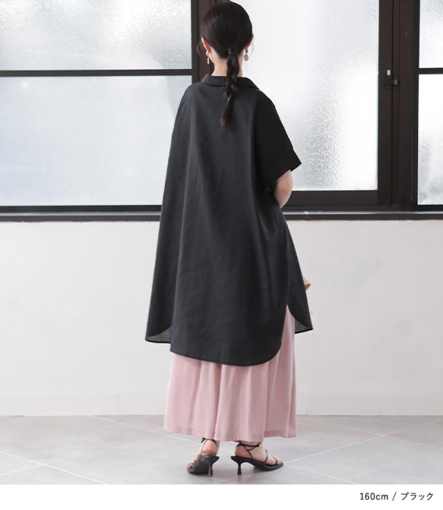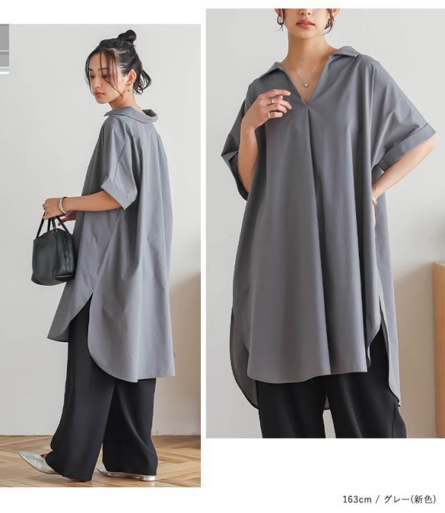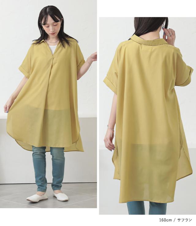 【新色登場】『スキッパーチュニック丈シャツブラウス』 ※メール便可※【5】[シャツ レディース トップス 春 夏 ブラウス 五分袖 半袖 プルオーバー チュニック丈 Vネック 襟付き ドルマン 折り返し袖 シアー 綿混 レイヤード 重ね着 無地 体型カバー 着痩せ]