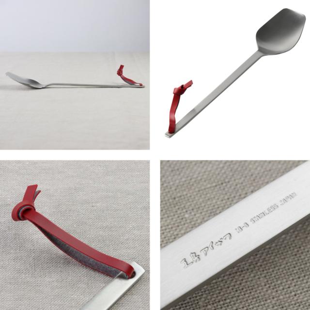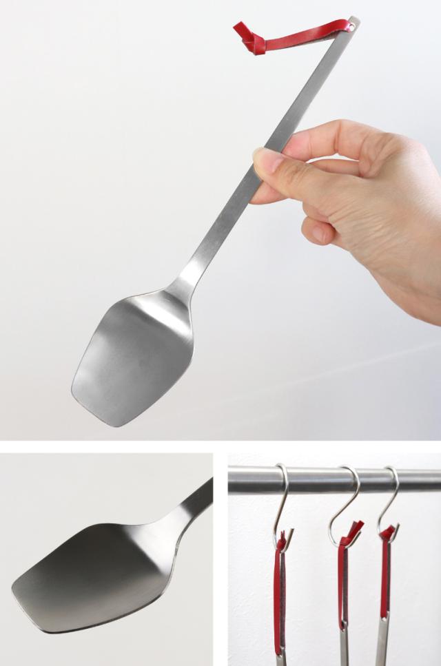 本体は錆びに強く丈夫な18-8ステンレス製です。表面はヘアライン仕上げとなっており、艶感を抑えた落ち着いた印象です。手に取ると程よい重みがあり持ちやすく、大きすぎないサイズ感で使いやすいです。また吊るし収納に活躍する赤い紐が、デザインのアクセントになっています。