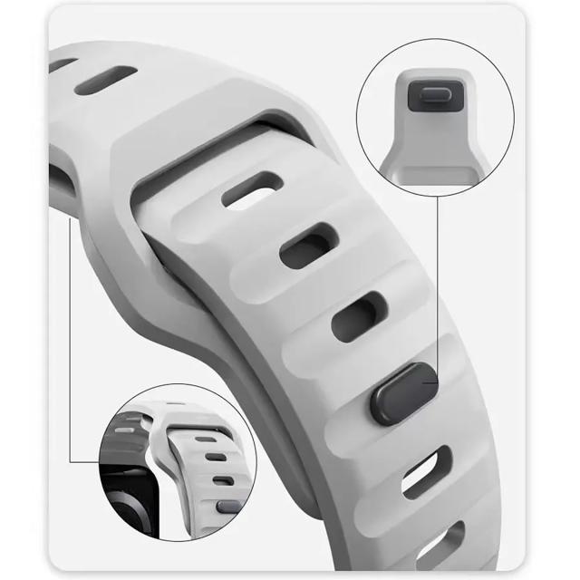 腕にとてもフィットします。またバックルを留める穴を沢山デザインする事により通気性を高めているのでシリコンによくある蒸れを防ぐのでジョギングやジムなどにとても適したバンドです。