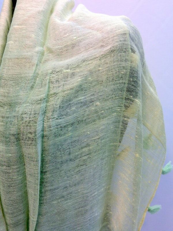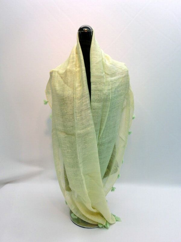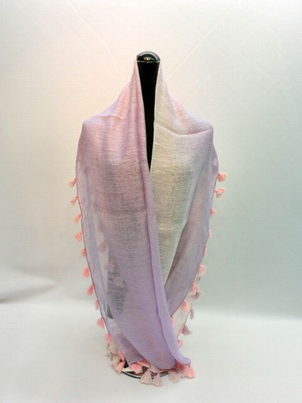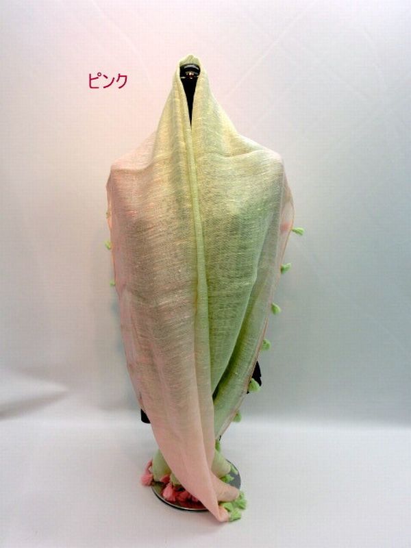 春夏らしい優しい色合いのグラデーションカラーのストールです。それぞれの辺についた2色の房がアクセントになっています。