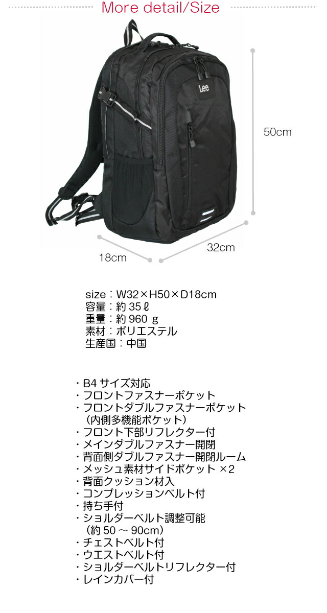 ![]() ![]() ![]() ![]() ![]() Lee(リー) A4ファイル・B4ファイル収納対応、「リー」の大容量35リットルのリュックサック。レインカバー付きで急な雨も安心です。小物の整理に便利な多機能ポケットや500mlのペットボトルなどが入るサイドポケットなど収納力も抜群!ずり落ち防止のチェストベルト付き、持ち手付き、ライトの光に反射するリフレクター付きも嬉しいポイント♪シンプルなデザインで使いやすく、子供からメンズ、レディースとユニセックスに幅広くお使いいただけます。普段使いに、マザーズリュックに、通学通勤に、アウトドアにと大活躍するリュックです。