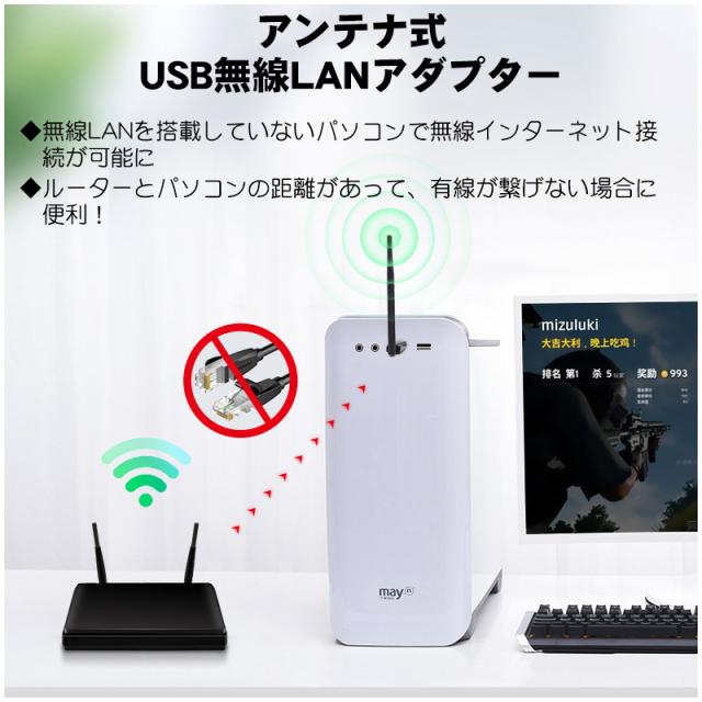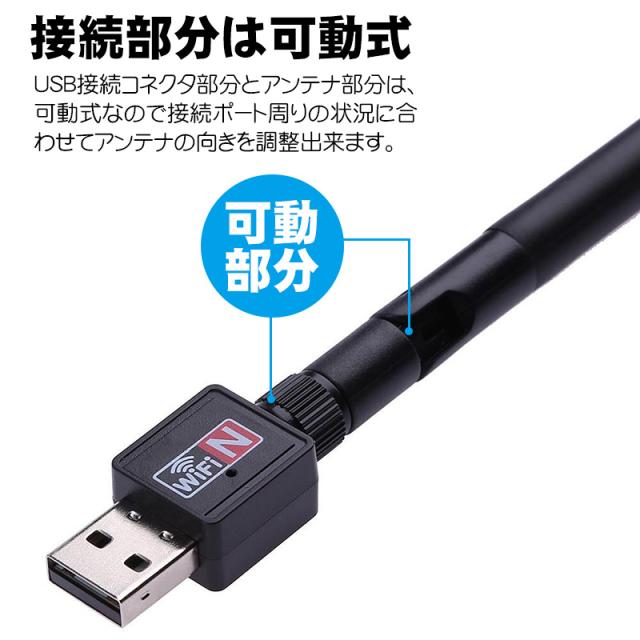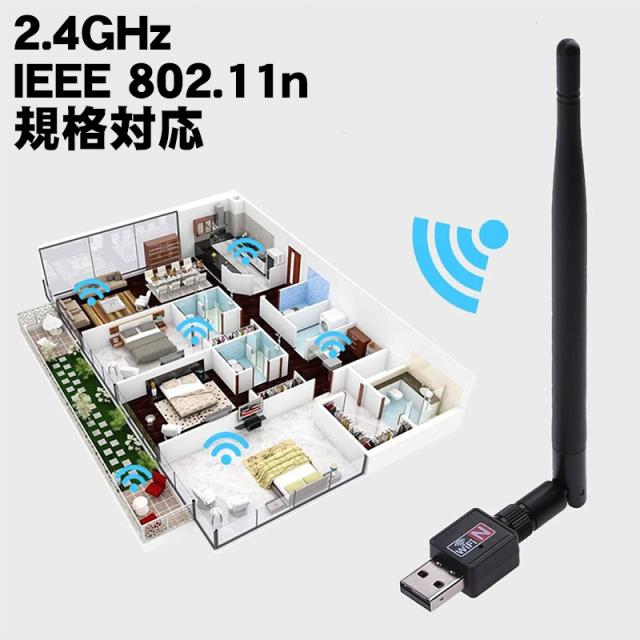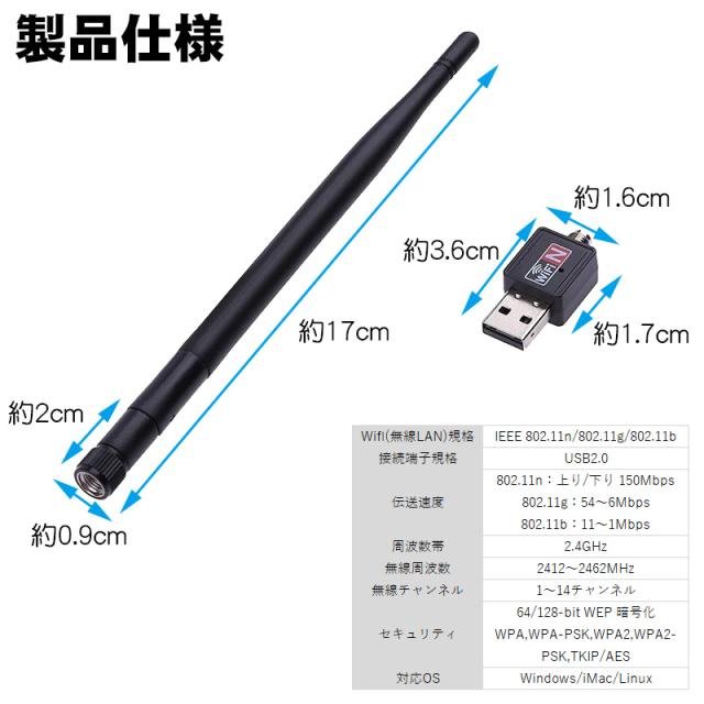 | 無線LANアダプター WiFi 子機 ワイヤレス アンテナ式 USB接続 802.11n 2.4GHz 150Mbps Windows MacOS Linux対応 パソコン デスクトップPC ノートPC用 回転 角度調整可能 小型 |