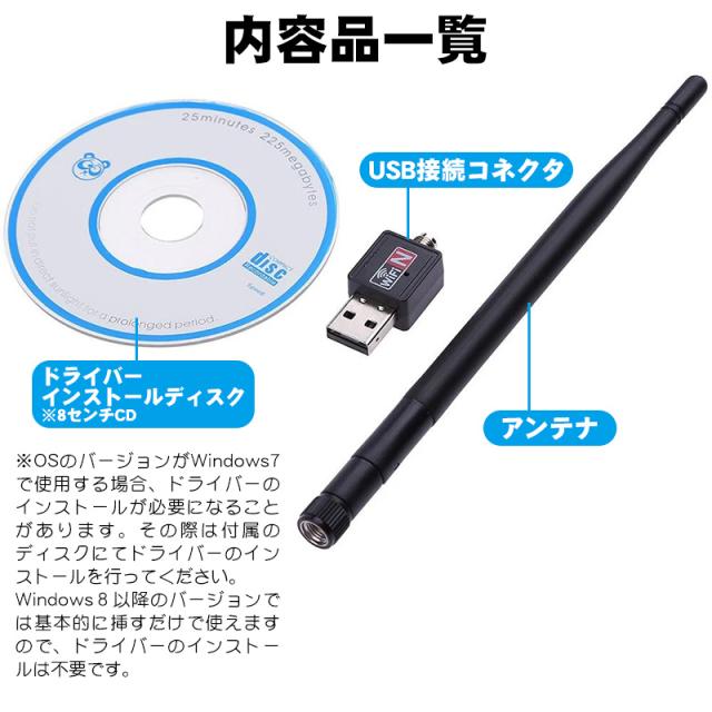 | USB接続コネクタ×1点 アンテナ×1点 ドライバーインストールディスク×1点 ※このディスクは、Windows7のOSバージョンで使用する場合にドライバーのインストールが必要になる場合があり、その際に必要となるディスクです。Windows8以降のバージョンでは基本的に挿すだけで使えますので、ドライバーのインストールは不要です。) |
